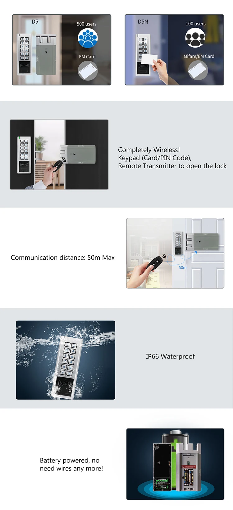FV-D5 / D5N is a Wireless smart lock kit for home use, it includes Wireless Keypad (metal, waterproof) + Wireless Lock + 2pcs Remote Transmitters + 5pcs RFID Tags